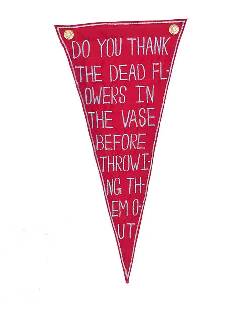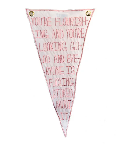 I am an embroidery artist who makes text banners to communicate as directly as possible. Most of my work derives from relatability, and although we may not all share the same experiences, I try to find the essence of those moments so that we can find the similarities. I want to believe that my practice starts with a reaction, develops from curiosity, and actualizes through reflection. There’s a running theme of being human, a mantra of being, “human on inside, human on the outside” because that is the core experience we are all going through.