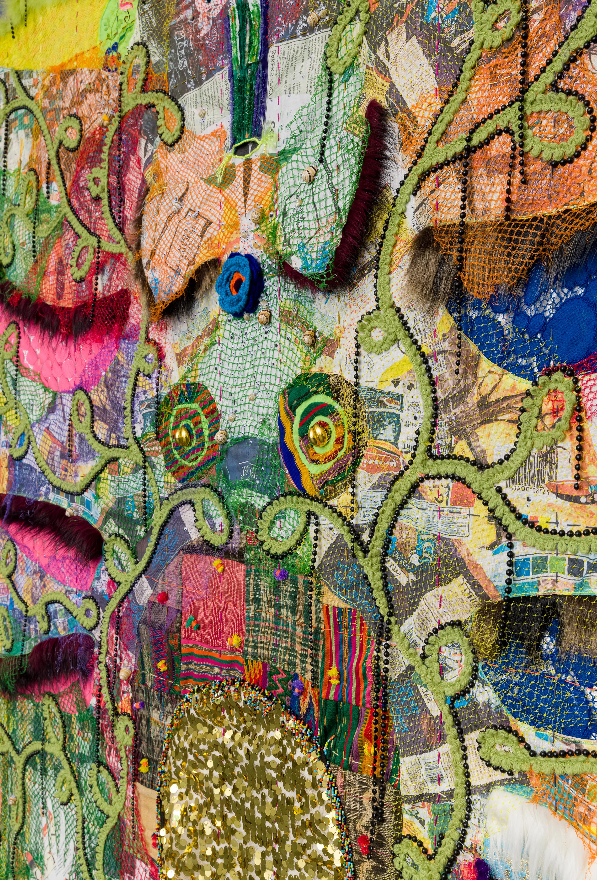 Lina Puerta, Cabbages and Radishes Parade Tapestry (from the Willard Crop’s Festival Series) (detail), 2019. 42" x 64" Overall. (8) panels of 21” x 16”. Handmade paper composed of pigmented cotton and linen pulp; embedded withlace, sequined and metallic fabrics; parts of previously worn and used embroidered Mayan huipil and Kuna cloths; discarded food packaging netting, ribbon, gouache, antique and commercial appliqués. Photo credit: Etienne Frossard.