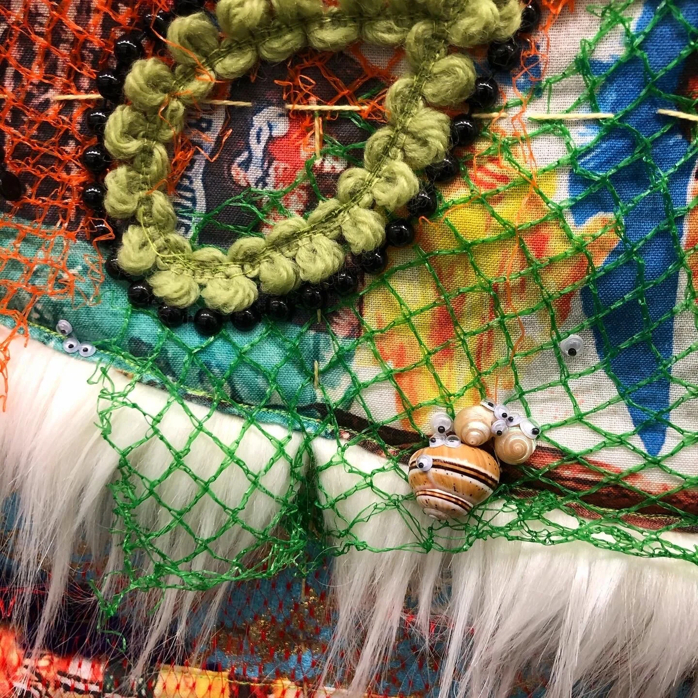Lina Puerta, Moth(er) (detail), 2020. 7’ x 6’. Quilt made with digitally printed fabric (created during 2017 Joan Mitchell Foundation Artist Residency, of food wrappings from food consumed by fellow resident artists); discarded food nets, recycled fabrics; hand-woven, indigenous Guambiano (Colombian) belt; Peruvian textile and t-shirt previously worn by artist; fake fur, sequined and textured fabrics; shells from necklaces, previously worn by the artist, purchased or gifted while in Colombia and the Caribbean; crocheted flower made by artist’s late mother, repurposed buttons and googly eyes. Photo credit: Etienne Frossard.
