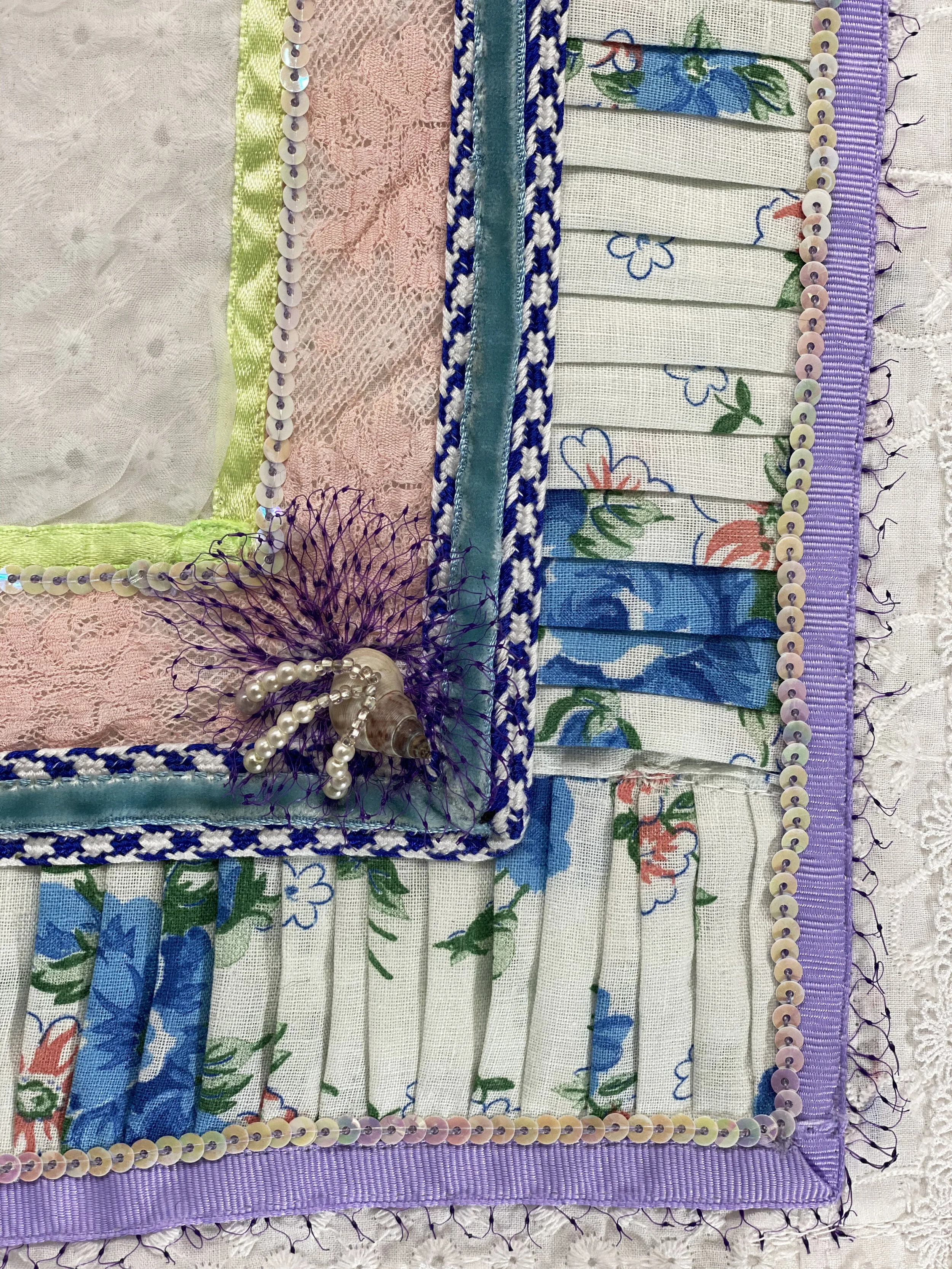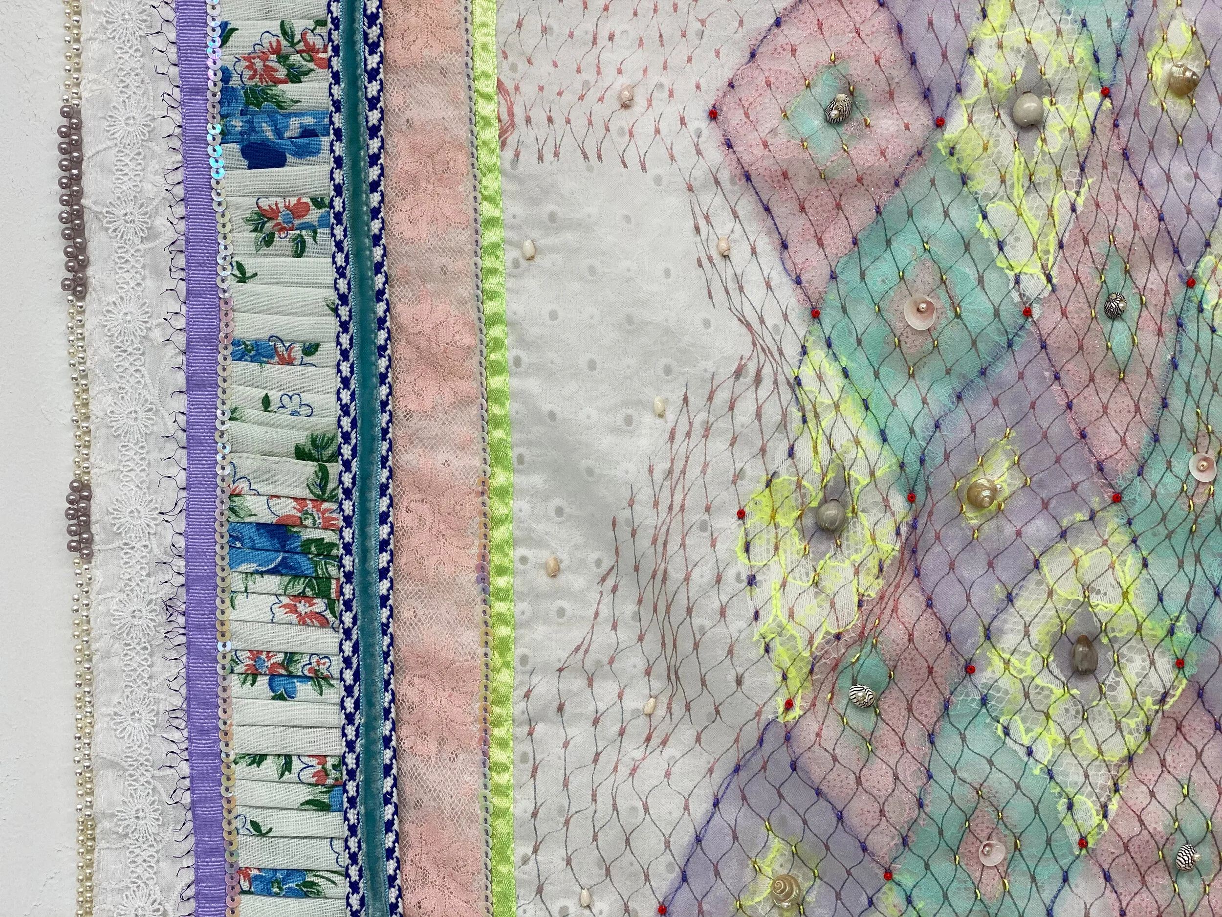 Lina Puerta, El Saparro (Canasto)/The Basket (detail), 2021. 35” H. x 27.5” W. Digitally printed organza silk (created during 2017 Joan Mitchell Foundation Artist Residency, of a discarded food net from food consumed by fellow resident artists), cotton and vintage fabrics; sequin, velvet, satin and lace ribbons; trim, thread, beads, fake and freshwater pearl beads; discarded food nets; seeds and shells from necklaces, previously worn by the artist, purchased or gifted while visiting Colombia and the Caribbean. Image courtesy of the artist.