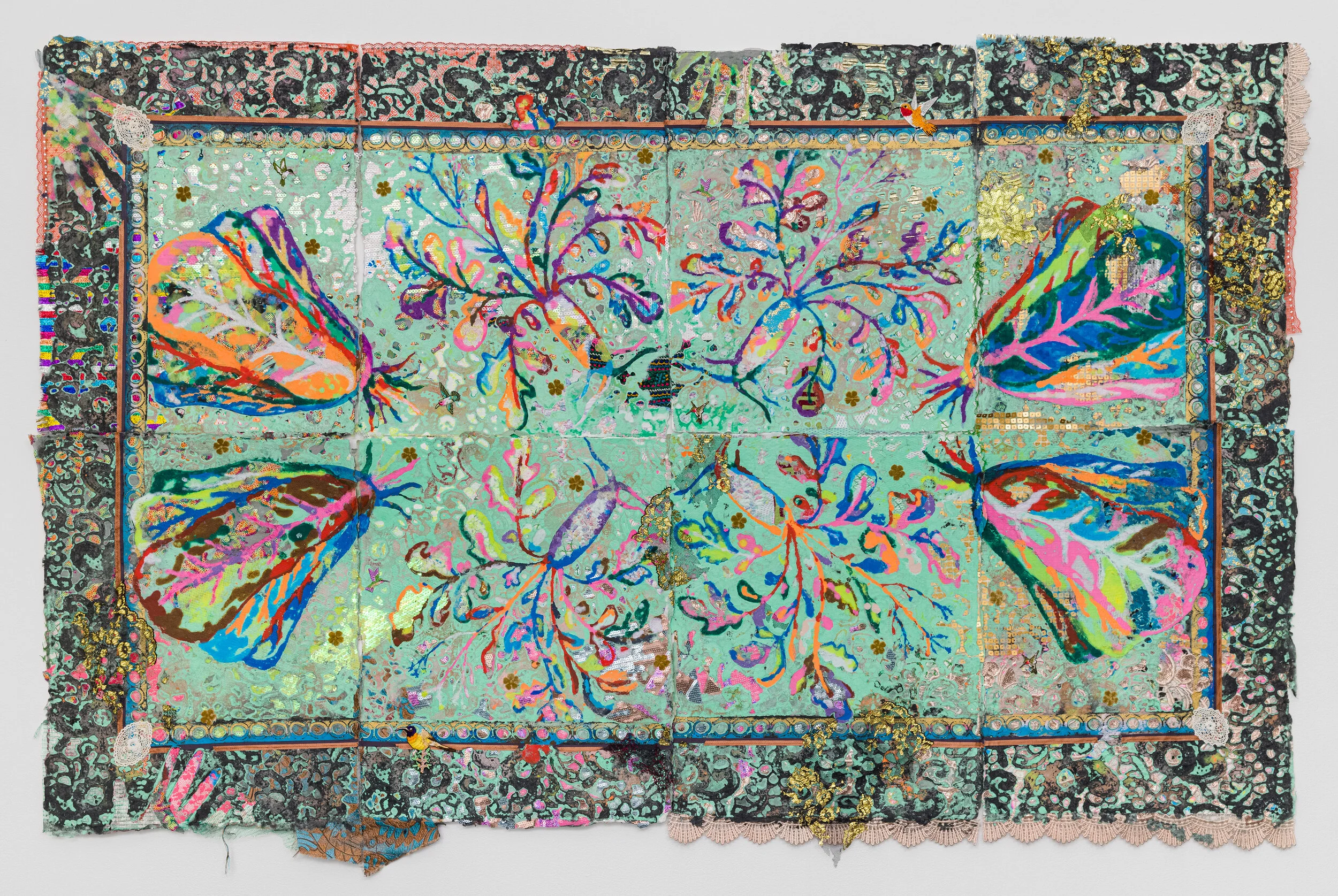 Lina Puerta, Cabbages and Radishes Parade Tapestry (from the Willard Crop’s Festival Series), 2019. 42" x 64" Overall. (8) panels of 21” x 16”. Handmade paper composed of pigmented cotton and linen pulp; embedded withlace, sequined and metallic fabrics; parts of previously worn and used embroidered Mayan huipil and Kuna cloths; discarded food packaging netting, ribbon, gouache, antique and commercial appliqués. Photo credit: Etienne Frossard.