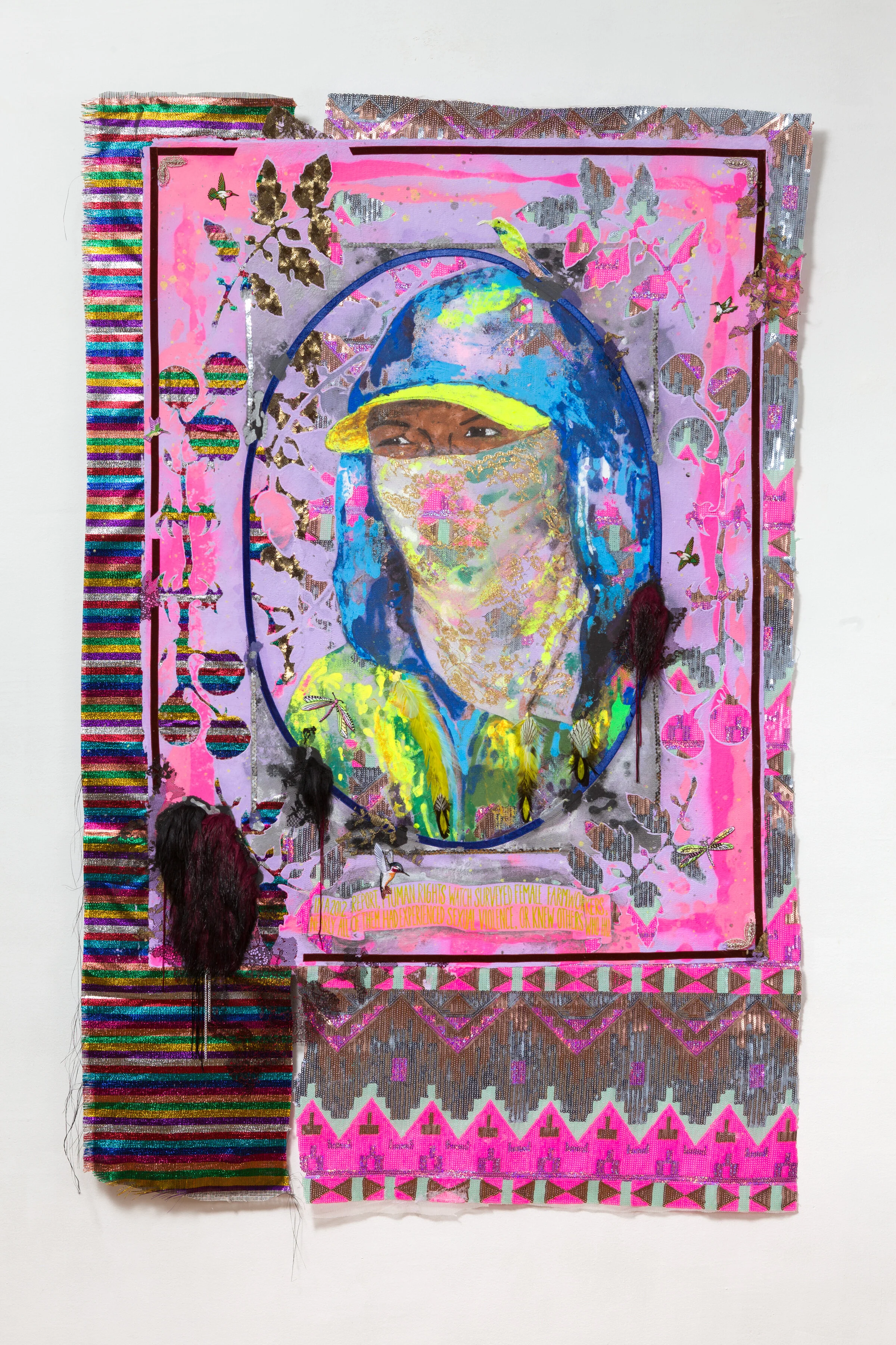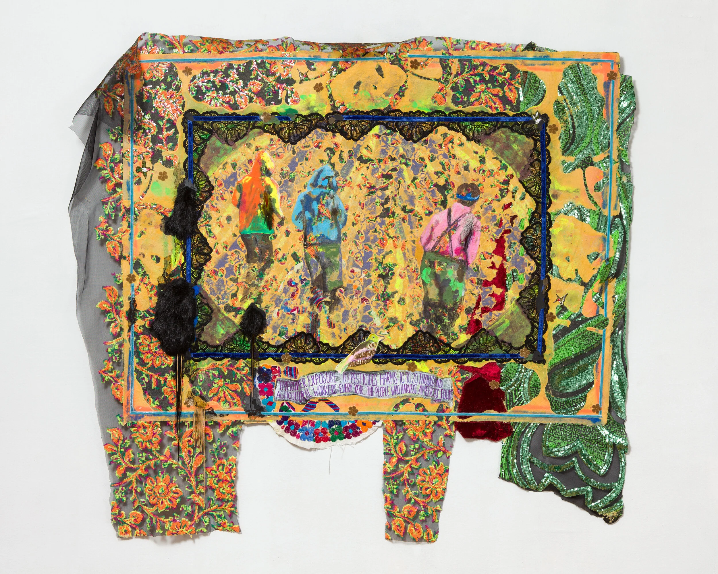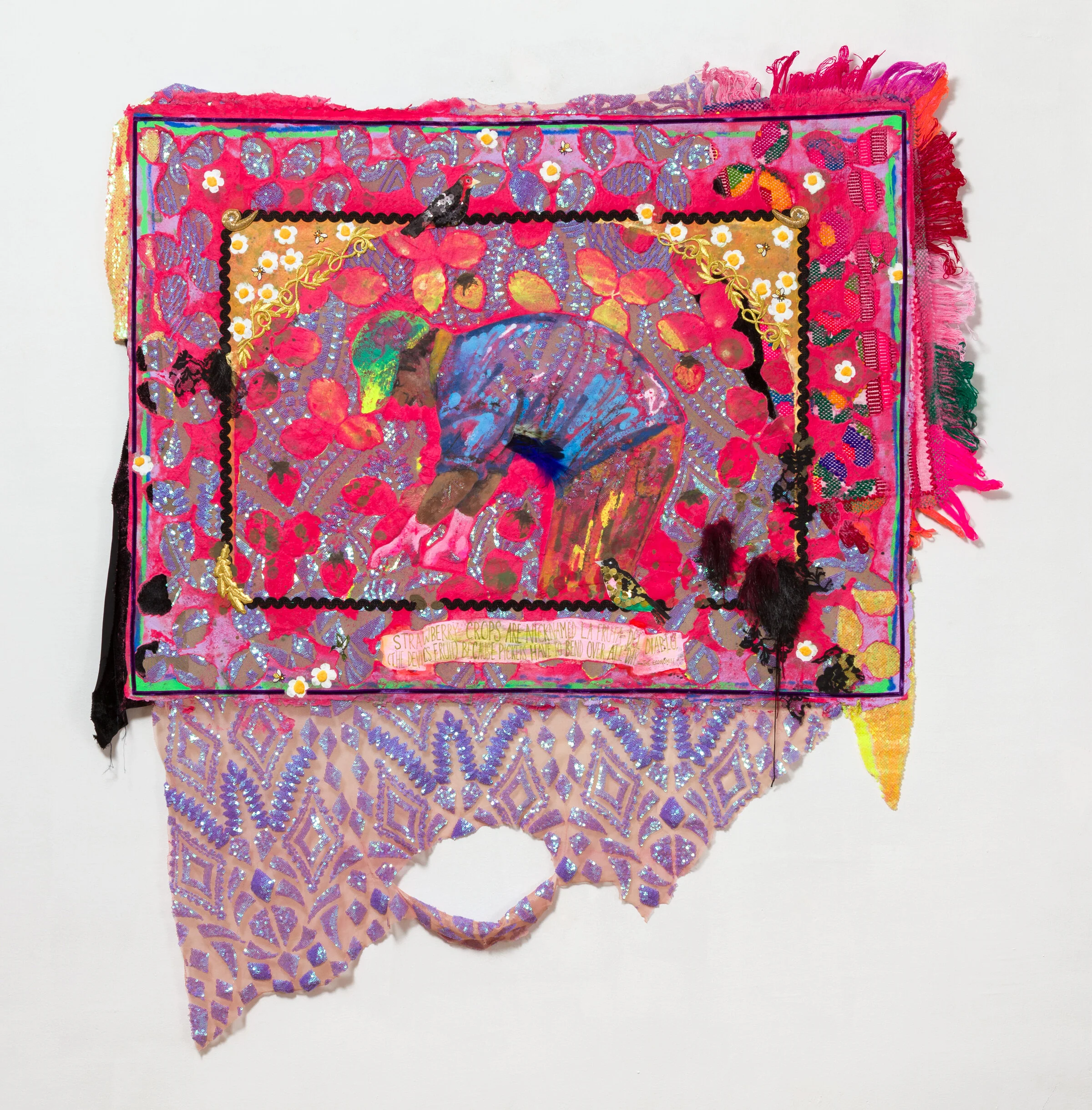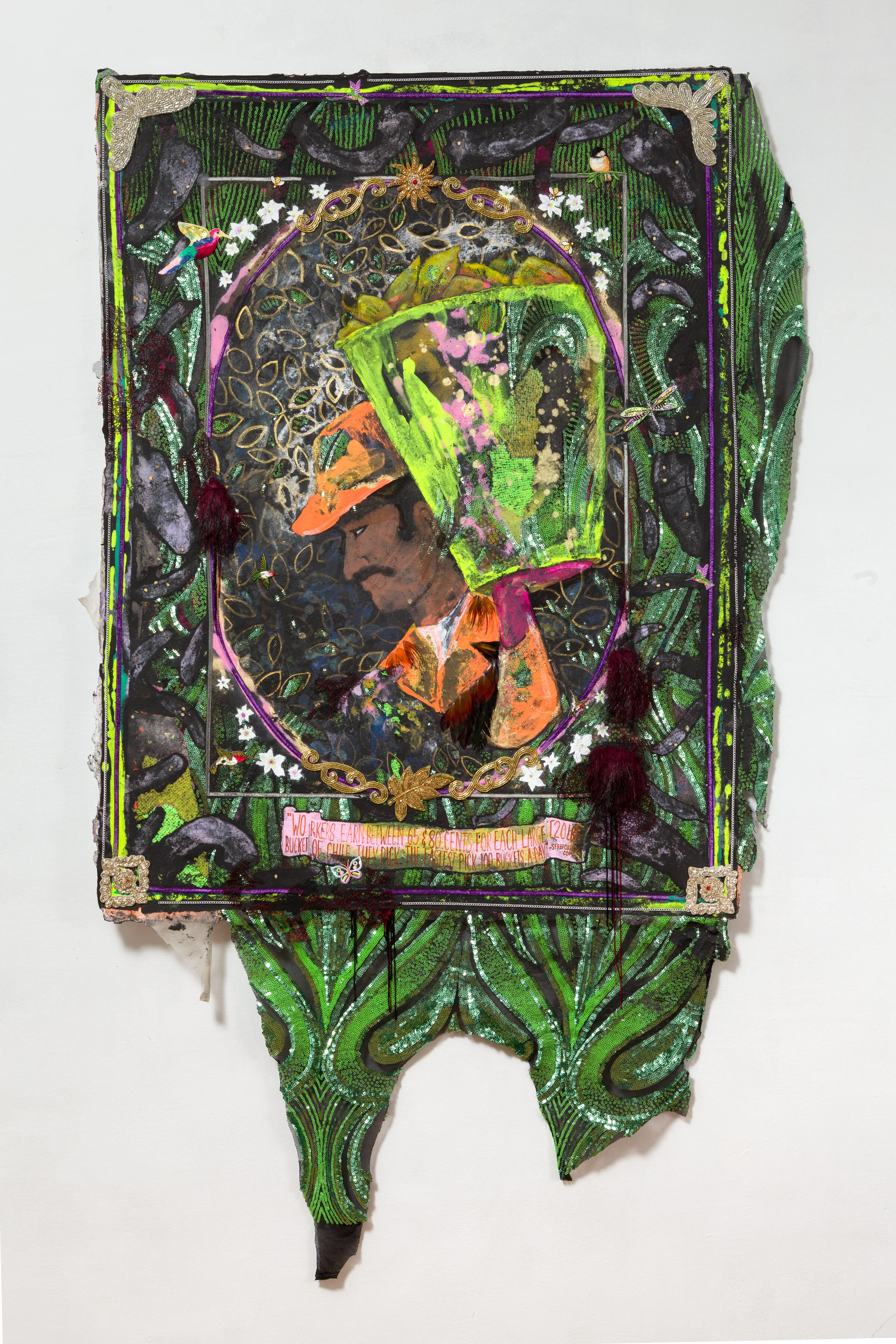Lina Puerta, Strawberry Crop Picker (from the Latino Farm Worker Series), 2017. 52” x 47”. Cotton and linen pulp; lace, velvet, sequined fabrics, handmade woven textile, trims, appliqués, velvet ribbon, fake fur, feathers, pom-poms and gouache. Photo credit: Jeanette May.