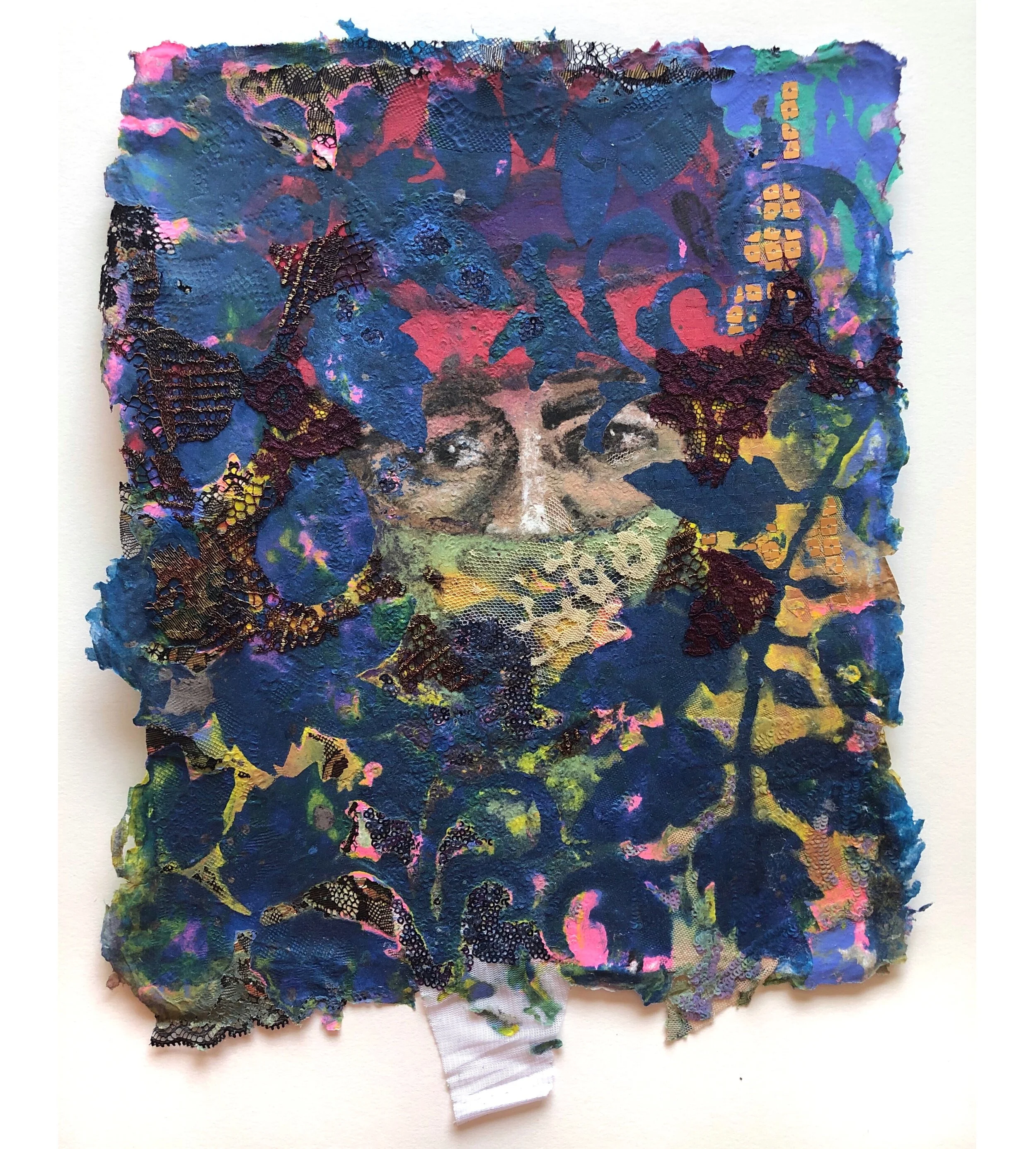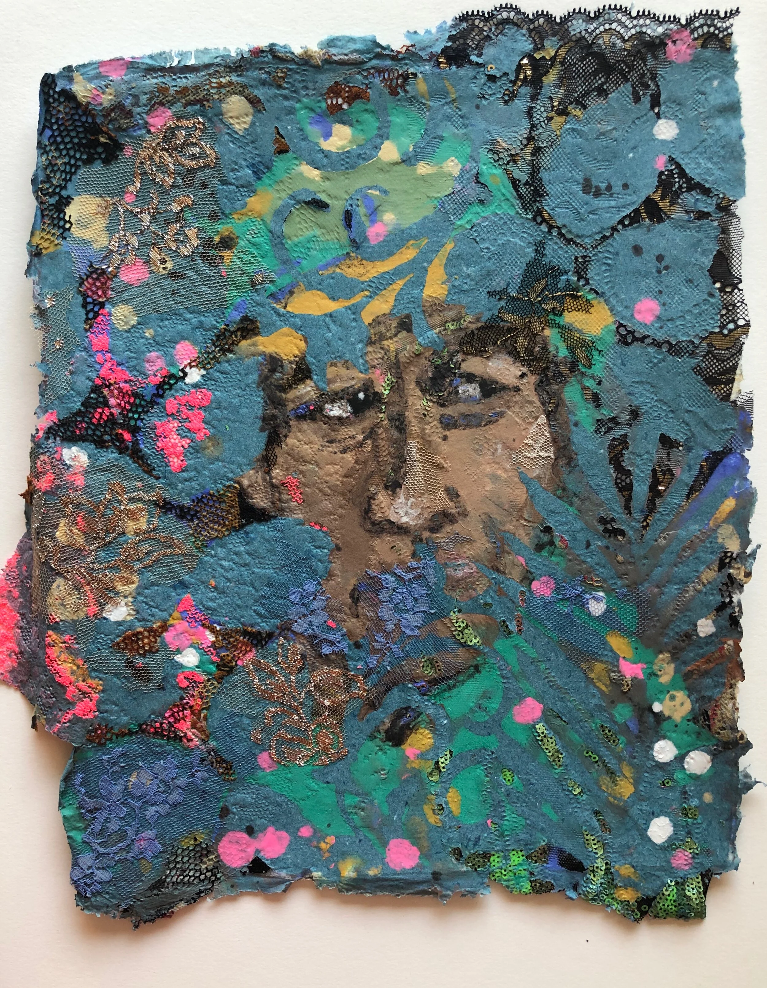 Lina Puerta, Untitled (Blue) (from the Latino Farmworkers in the US - Portraits Series), 2018. 16” x 13”. Pigmented cotton and linen pulp; sequined fabrics and lace. Image courtesy of the artist.