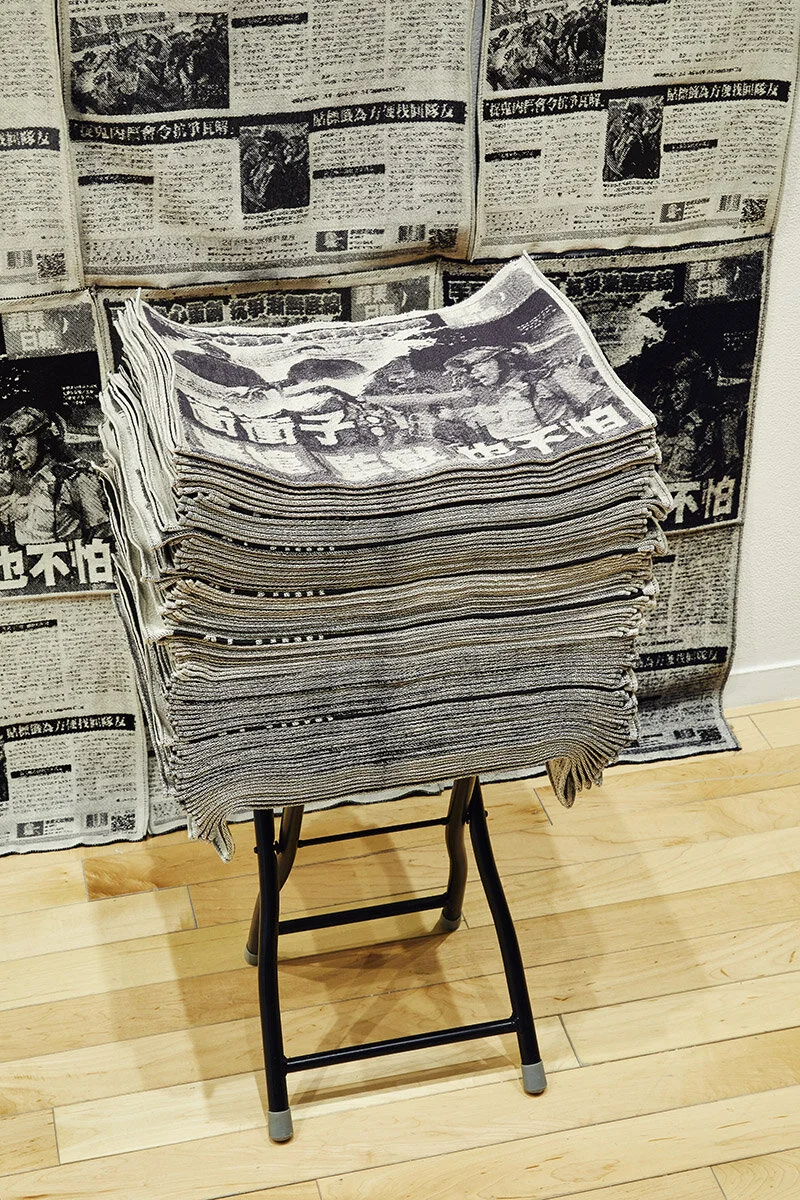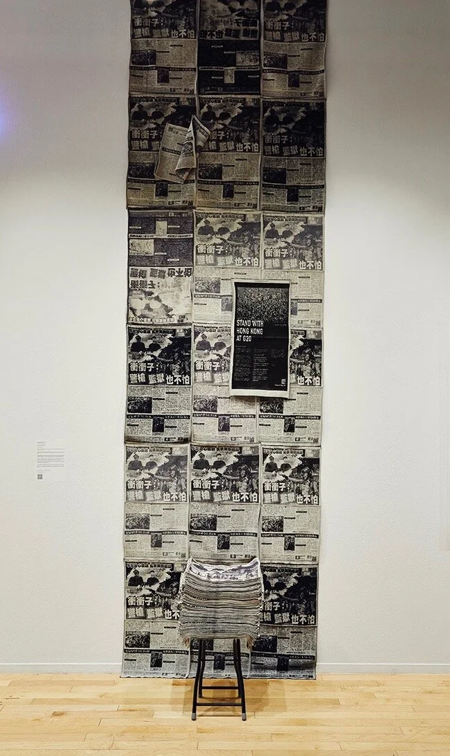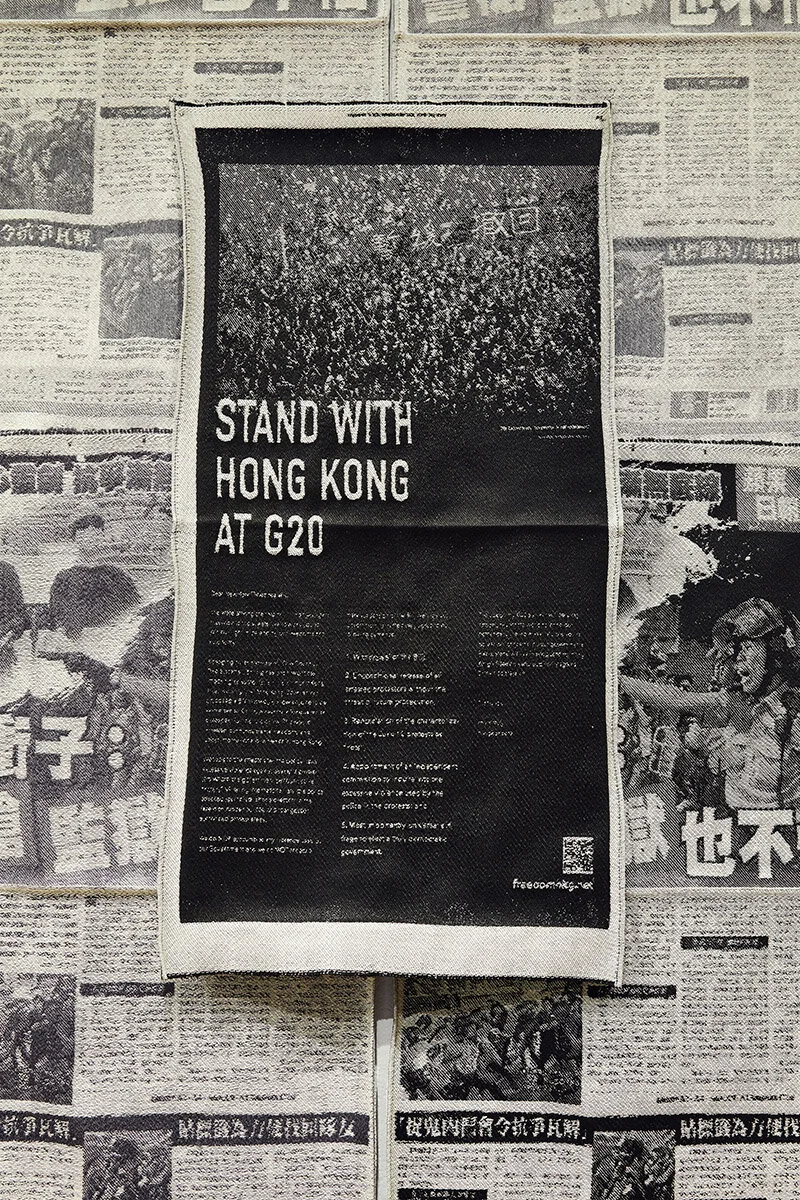 Percy Lam, Stand With Hong Kong, 2020. Jacquard weaving, cotton, polyester, and folded chair. dimensions variable. Photo by Tony Favarula.