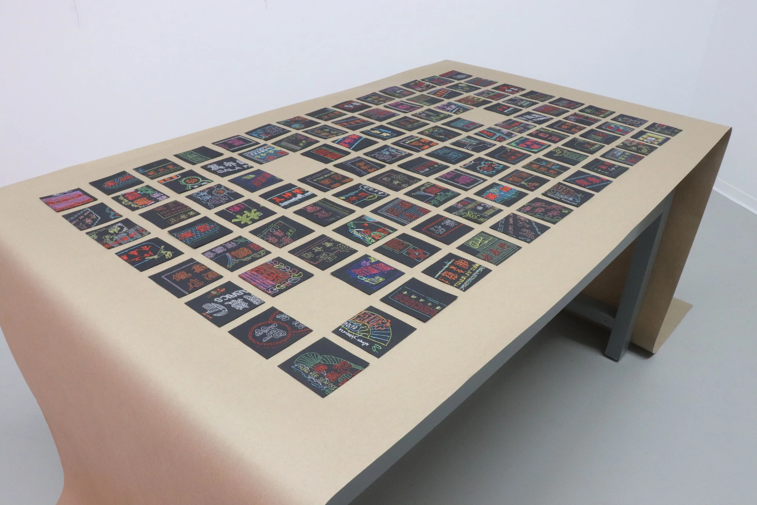Percy Lam, Millions of Neon Show: The Light of Hong Kong, 2017-present. Hand-embroidered paper. 3 x 3 in (each). Photo by Jonel Jugueta.